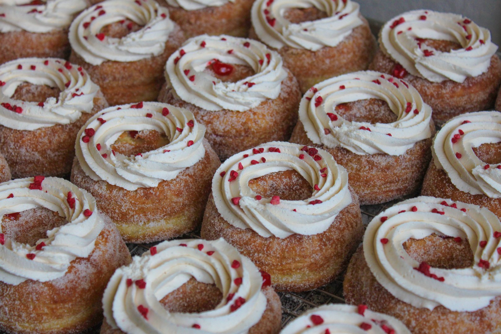 *FEBRUARY FEATURE* croissant dough cut and fried like a doughnut (so it has the flaky, airy layers of a croissant); tossed hot in sugar, filled with raspberry filling, topped with vanilla bean buttercream and freeze dried raspberries